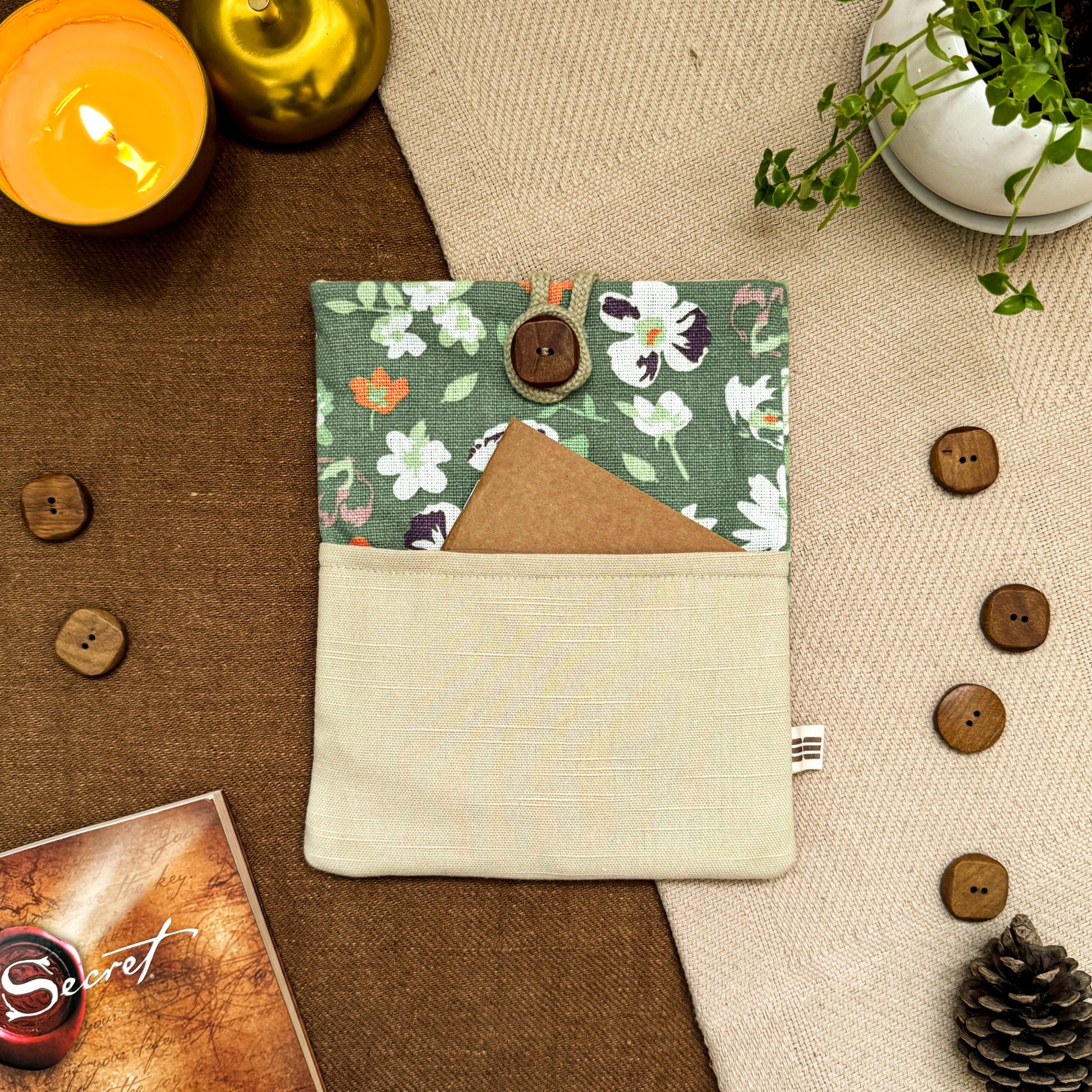 Keep your books safe and stylish with our handcrafted, lightly padded book sleeves. Designed to protect from wear and tear, they offer extra cushioning while adding charm. The front pocket has plenty of space for your bookmarks, notes, or small essentials. A simple button and cotton cord closure securely fasten the sleeve. With washable fabric and a lightweight design, it’s easy to carry and maintain. Each sleeve is a cozy home for your novels, notebooks, or sketchbooks.
